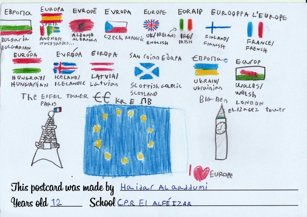 Dat is nog eens een leuke verrassing! De 12-jarige Haitar Alaaddumi uit Granada, Spanje, stuurde ons een superleuke vakantiekaart toe. Met een Europees tintje natuurlijk! Op deze kaart tekende Haitar wat Europa voor haar betekent.